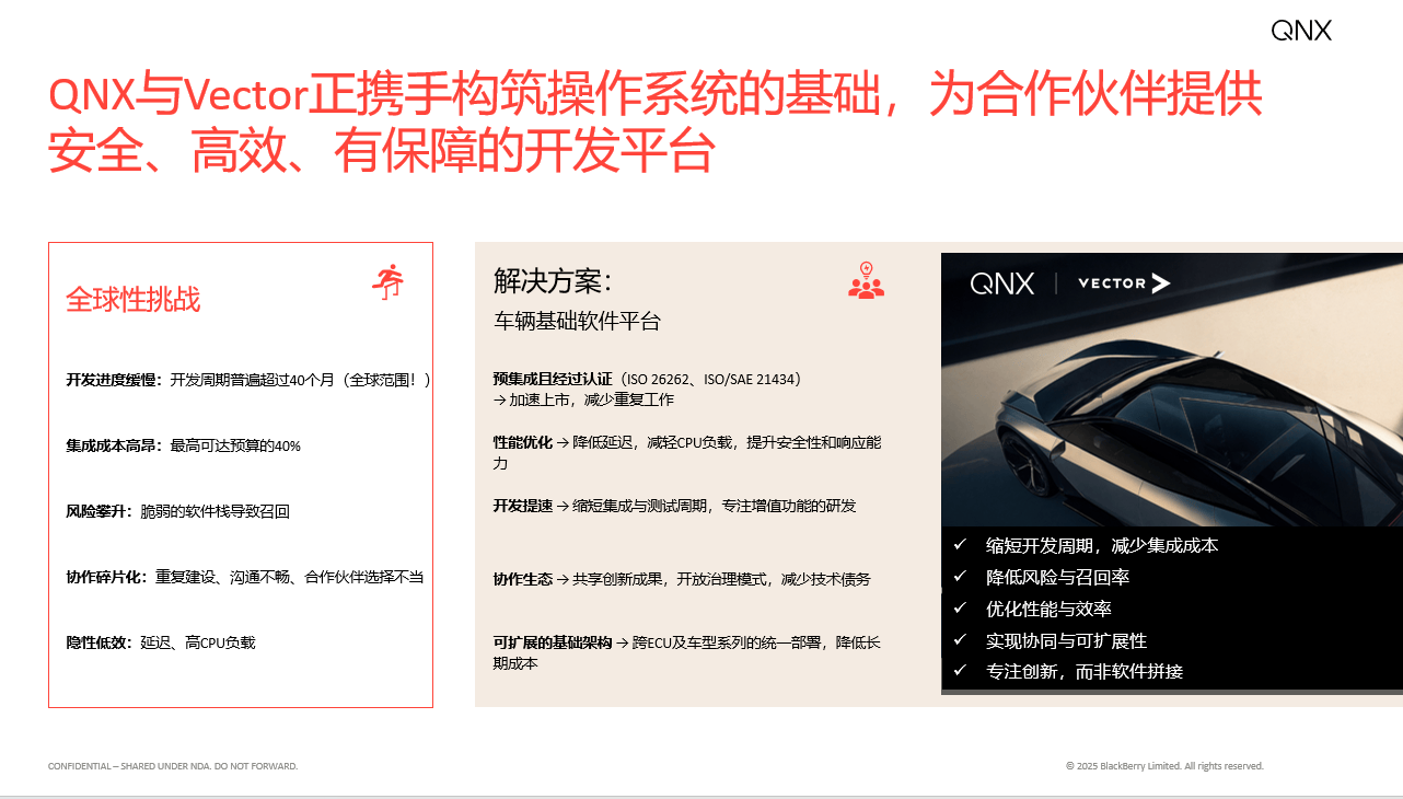 QNX将其全球性挑战总结为5个方面:1、开发进度缓慢,开发周期普遍超过40个月;2、集成成本高昂,最高可达预算的40%;3、风险攀升,脆弱的软件栈导致召回;4、协作碎片化,重复建设、沟通不畅、合作伙伴选择不当;5、隐性低效,延迟、高CPU负载。