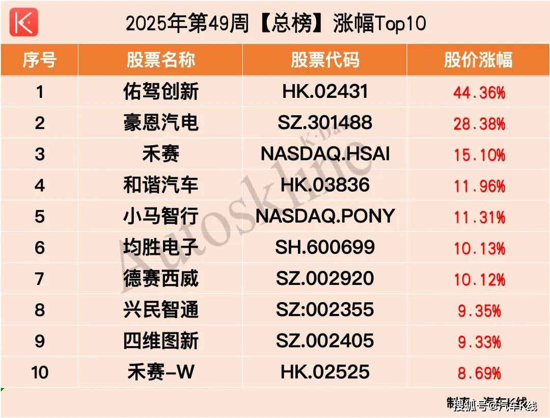 豪恩汽电和禾赛美股分别以28.38%和15.1%的周涨幅排在总榜第2、3位。