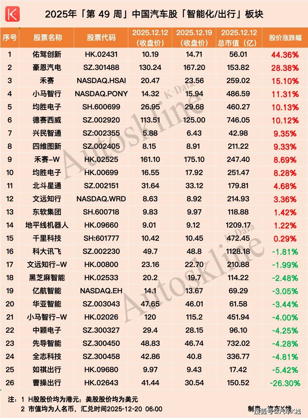 佑驾创新、禾赛等公司凭借扎实的订单或技术突破,将政策利好转化为股价强势上涨;而曹操出行面临解禁压力、恩捷股份遭遇收购疑虑、极星汽车深陷经营困境,则无法摆脱下跌命运。