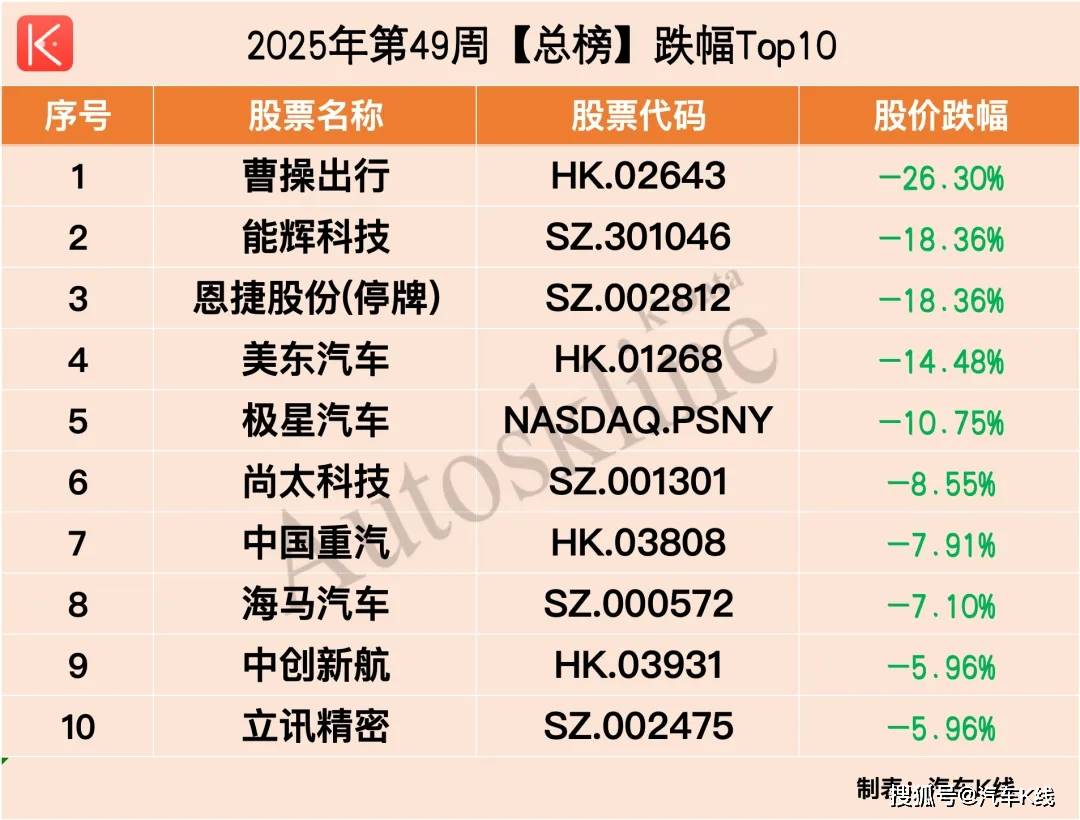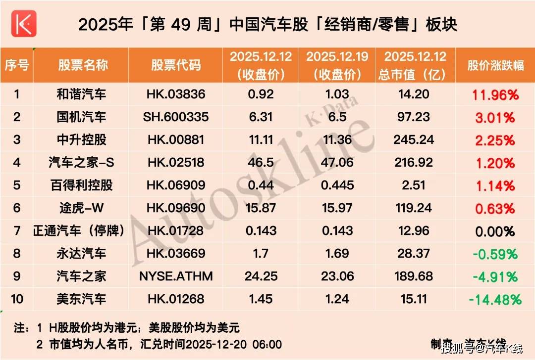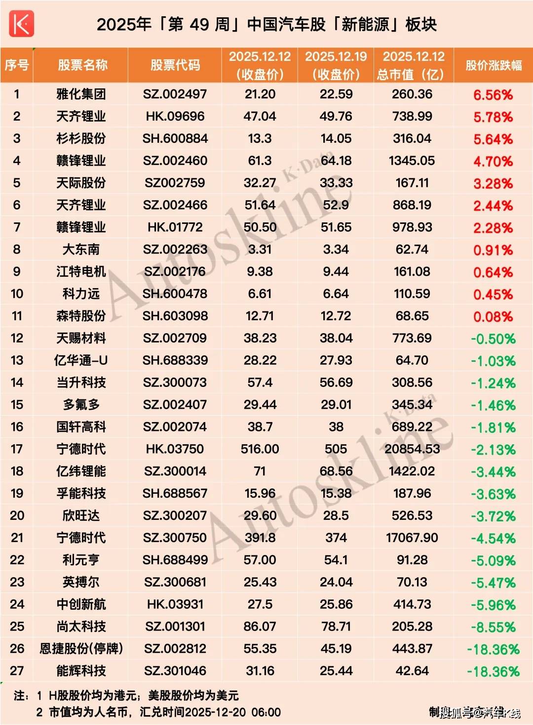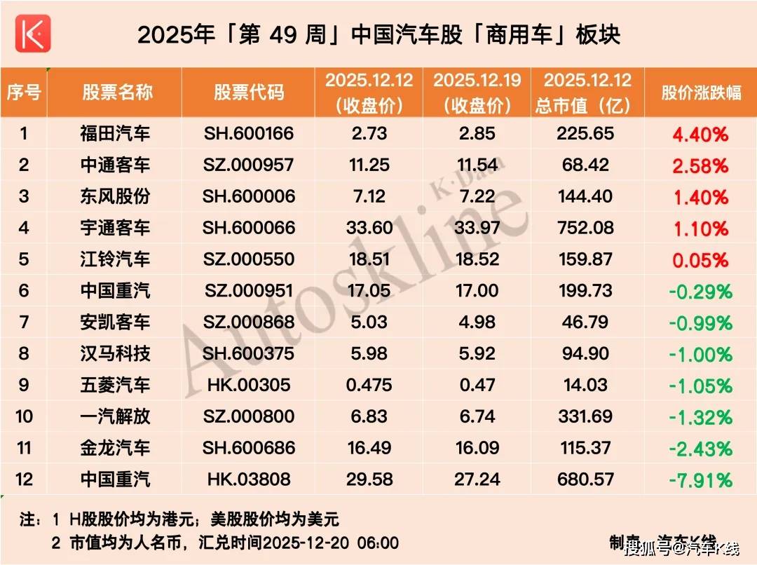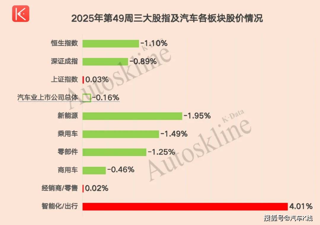 聚焦到汽车行业,《汽车K线》统计的122只中国汽车股,第49周涨少跌多,平均股价下跌0.16%。