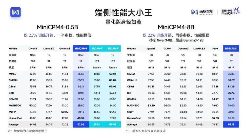 MiniCPM4.0-0.5B则通过极致轻量化设计,以2.7%的训练开销,相较Qwen-3-0.6B、Llama 3.2等实现了性能翻倍。
